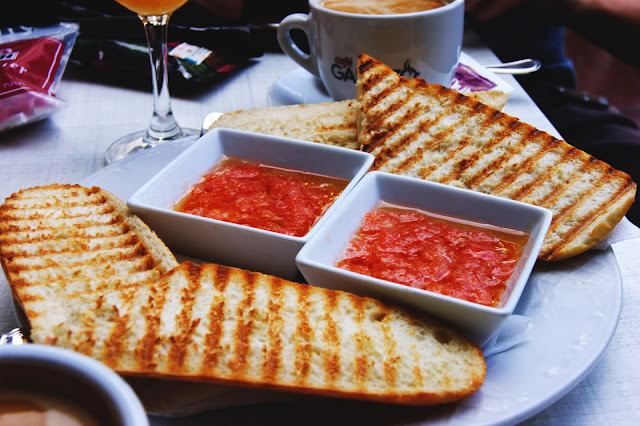 Повсеместно в кафе утром предлагают набор: чашка кофе, апельсиновый сок, круассаны или тосты на выбор. Стоит удовольствие от 2-х евро.
