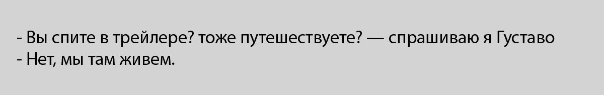 — Вы спите в трейлере? Тоже путешествуете? — спрашиваю я Густаво.